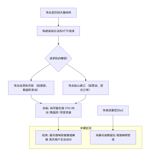 您可以把它理解为:不是用一股巨力(大流量DDoS)直接冲垮你的大门,而是雇佣成千上万的人(肉鸡/代理),每人以正常方式但不停地挤进你的店铺,问最复杂的问题、浏览最耗时的页面,直到你的店员精疲力竭,无法服务任何真正的顾客。